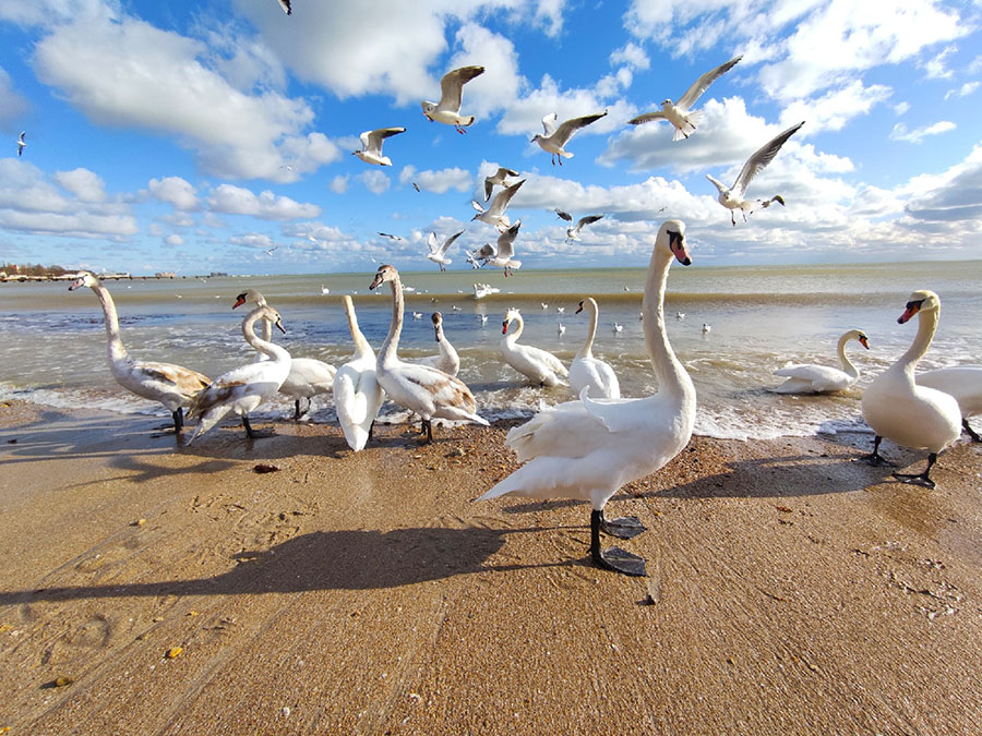 Под Евпаторией Крыма озеро с говорящим названием является частью озера Сасык-Сиваш. Однако в этой его части оно опреснилось за последние несколько лет, и поэтому стало пригодным для жизни лебедей, которые и являются здесь вишенкой на торте. Сотни красивых белых птиц живут тут круглый год. Лебеди выступают тут в роли фотомоделей и живого аттракциона, привлекают своей изящностью толпы туристов, которые всегда подкармливают их булками и хлебом.